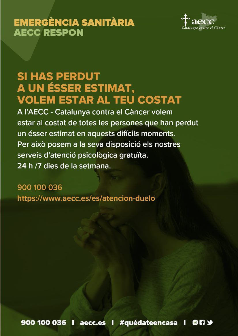 Desde la Asociación Española Contra el Cáncer queremos estar al lado de todas las personas que han perdido un ser querido en estos momentos. Nuestro compromiso como Asociación nos mueve a estar al lado de las personas que sufren en estos momentos y queremos poner a su disposición a nuestros profesionales para que puedan orientales y ayudarles a elaborar todas estas emociones que se desencadenan con la salida de casa de su ser querido, la llamada que anuncia la muerte y la despedida y duelo en soledad.