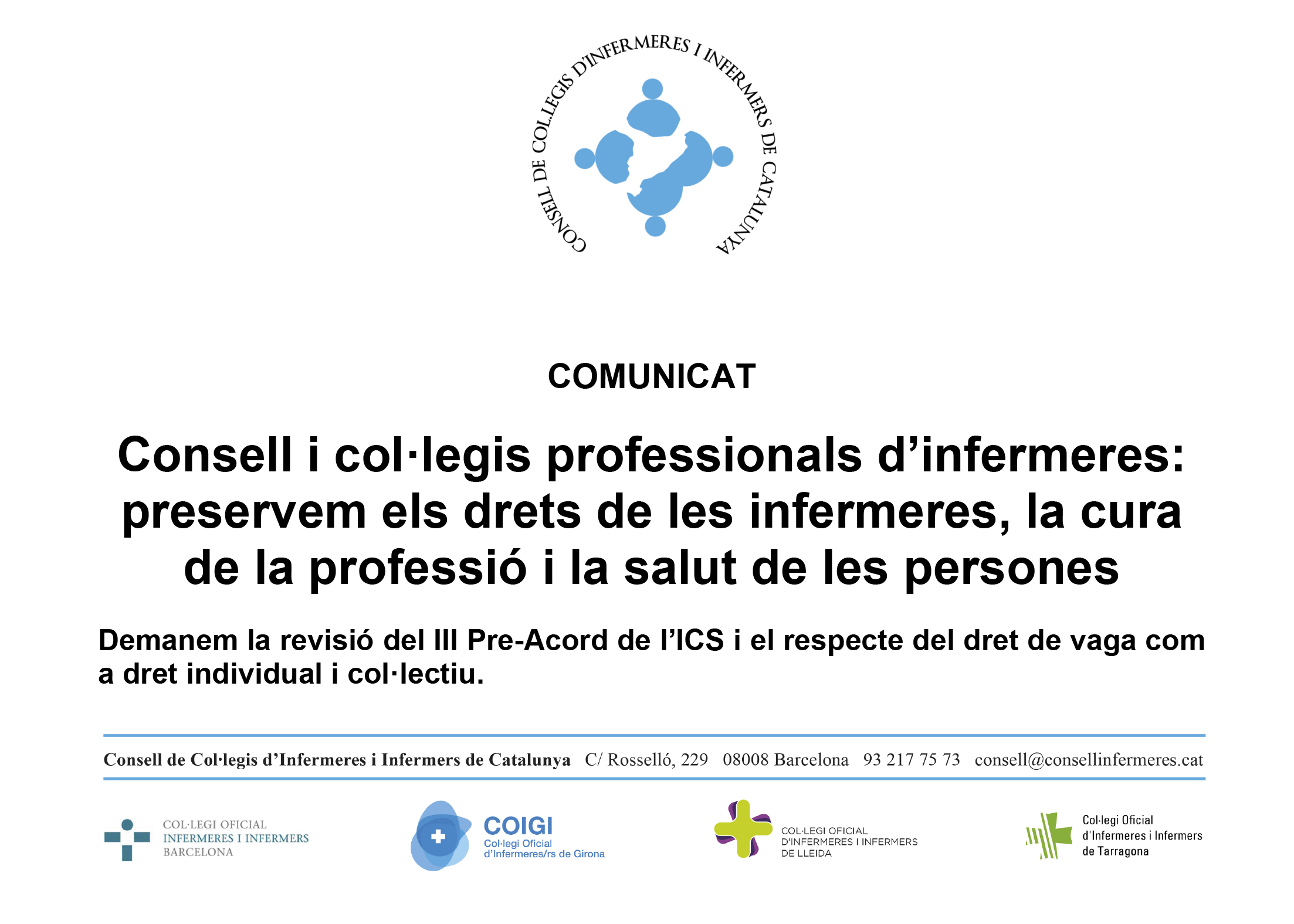 El Consell de Col·legis d’Infermeres i Infermers de Catalunya (CCIIC) i els col·legis oficials de Barcelona (COIB), Girona (COIGI), Lleida (COILL) i Tarragona (CODITA) manifestem que, com a corporacions de dret públic, tenim com a finalitat la representació i defensa general de la professió infermera d’acord amb els interessos i les necessitats dels ciutadans i ciutadanes de Catalunya.