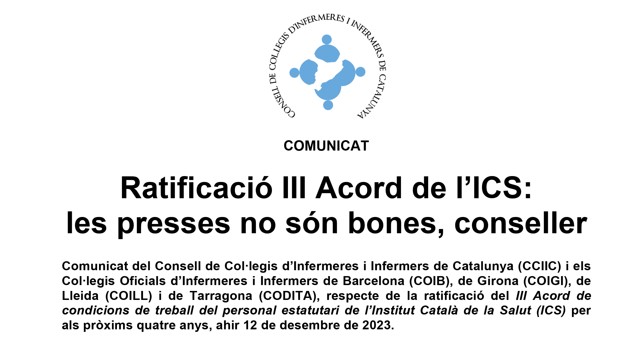 El Consell de Col·legis d’Infermeres i Infermers de Catalunya (CCIIC) i els Col·legis Oficials d’Infermeres i Infermers de Barcelona (COIB), de Girona (COIGI), de Lleida (COILL) i de Tarragona (CODITA), volem manifestar el nostre desacord per la ratificació del III Acord de condicions de treball del personal estatutari de l’Institut Català de la Salut (ICS) per part del Govern de Catalunya, el dia 12 de desembre de 2023.