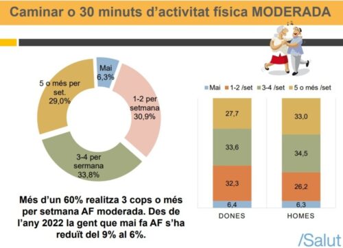 Entre les 2.290 persones enquestades, les activitats més populars són caminar, les sessions de musculació i la participació en classes dirigides, com ara el ioga o pilates, entre altres. A més, un 70% de les persones consultades afirmen desplaçar-se de manera activa i el 52% fan els desplaçaments habituals caminant o en bicicleta, mentre que el 18% ho fa amb transport públic. Una dada destacada d’aquesta mobilitat és que el 50% dels infants va caminant a l’escola.