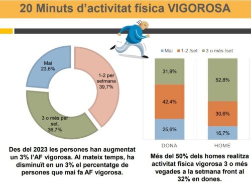 A Catalunya, segons les dades obtingudes a través de l’enquesta poblacional que realitza cada any l’Agència de Salut Pública de Catalunya (ASPCAT) per avaluar els hàbits d’activitat física, el 50% de les persones realitzen suficient activitat física. Per diferències de gènere i edat, el 56% de les dones són prou actives respecte del 73% dels homes en la població de menys de 25 anys; i un 45% de les dones són actives enfront del 61% dels homes en majors de 25 anys.