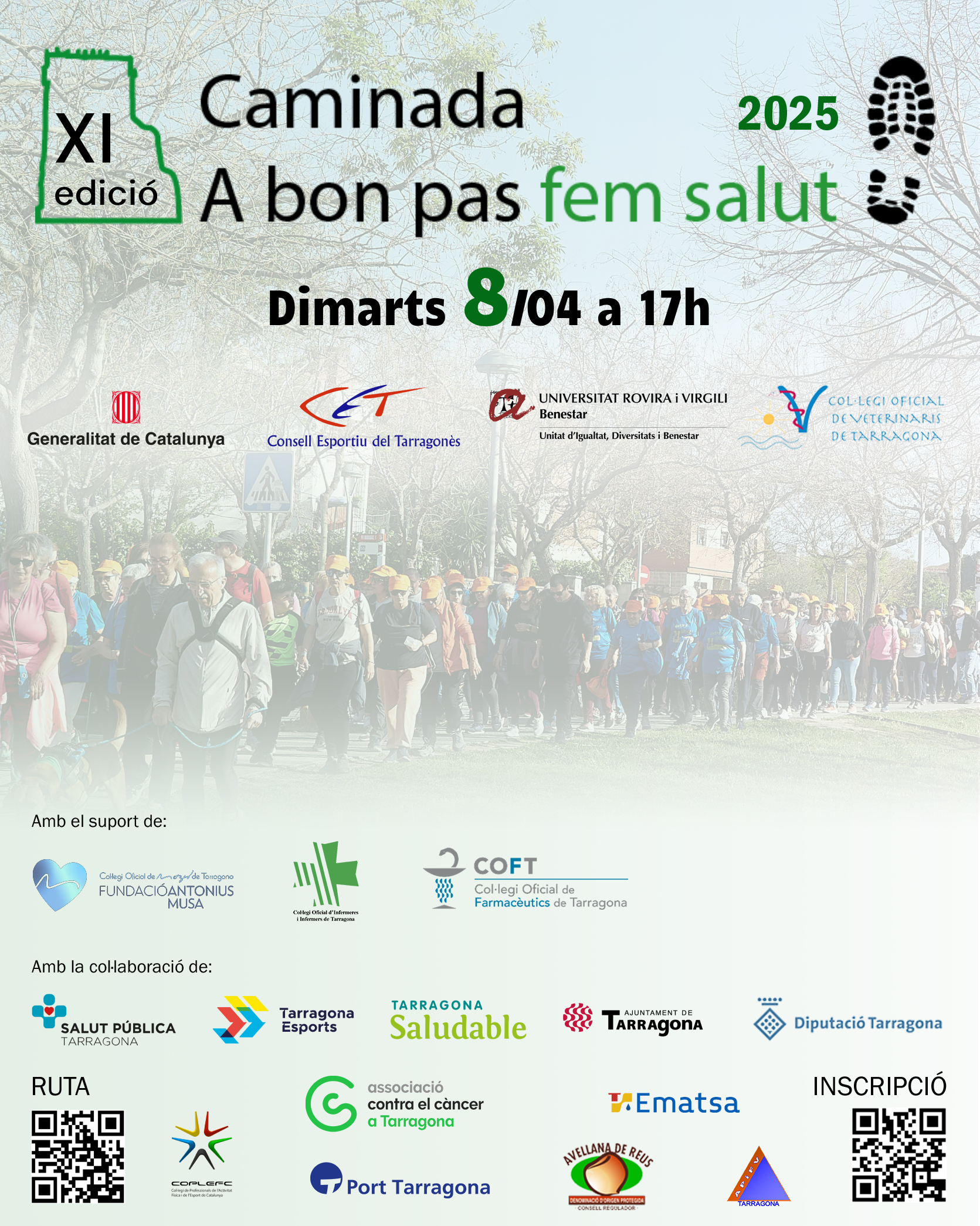 L’activitat física genera benestar i salut física i mental. Amb l’objectiu de contribuir a promoure l’activitat física i reduir el sedentarisme al nostre territori, i en el marc del Dia Mundial de l’Activitat Física, un any més organitzem l’onzena Caminada A bon pas fem salut 2025, que tindrà lloc a Tarragona el dimarts 8 d’abril.