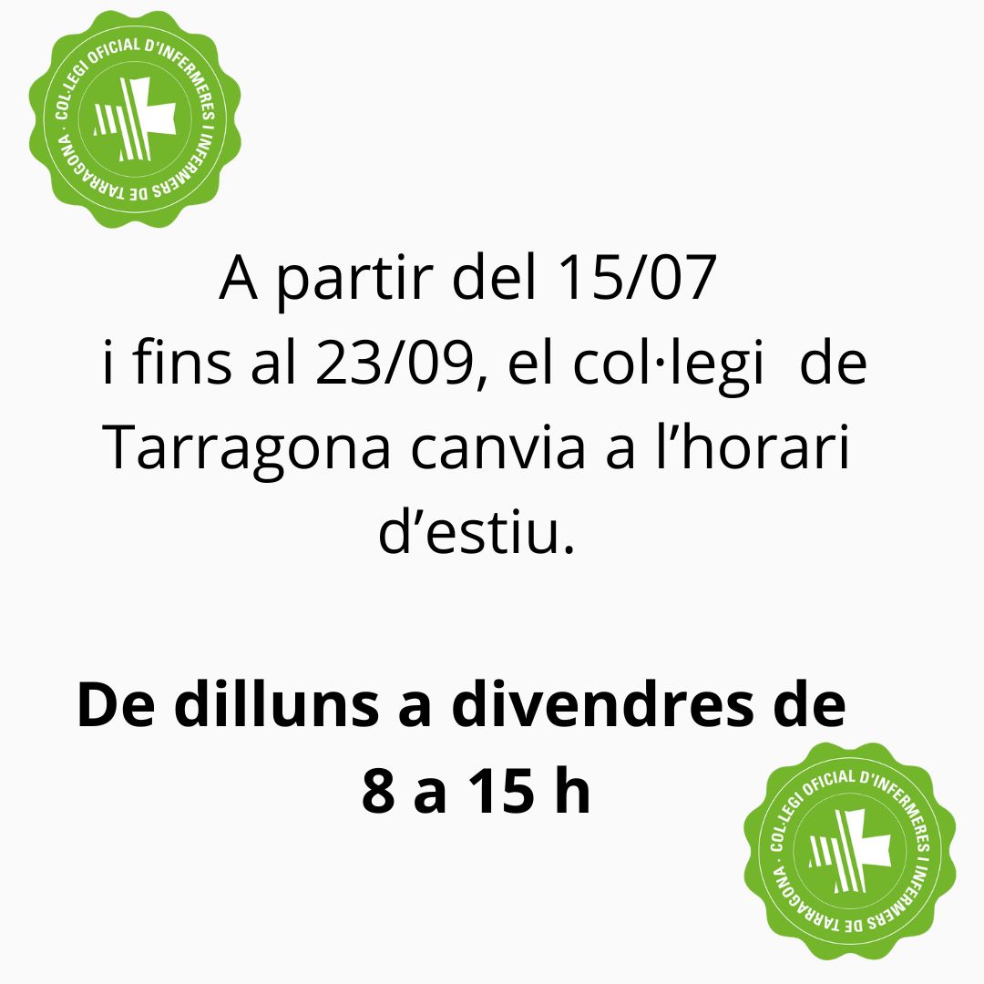 Us informem que a partir del dia 15/07 i fins al dia 23/09, el col·legi de Tarragona canvia a l’horari d’estiu que serà de dilluns a divendres de 08.00 a 15.00 h.