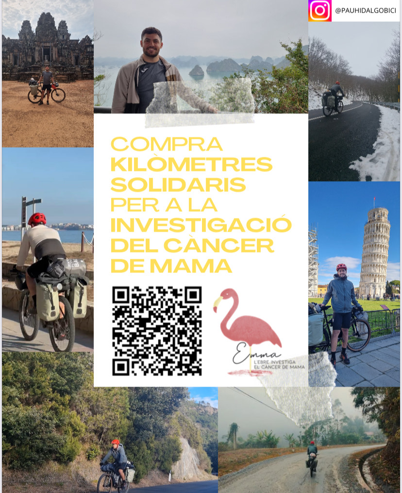 El gener de 2025, Pau Hidalgo va començar la volta al món en bicicleta per recaptar fons per al Projecte Emma per a la investigació contra el càncer de mama.